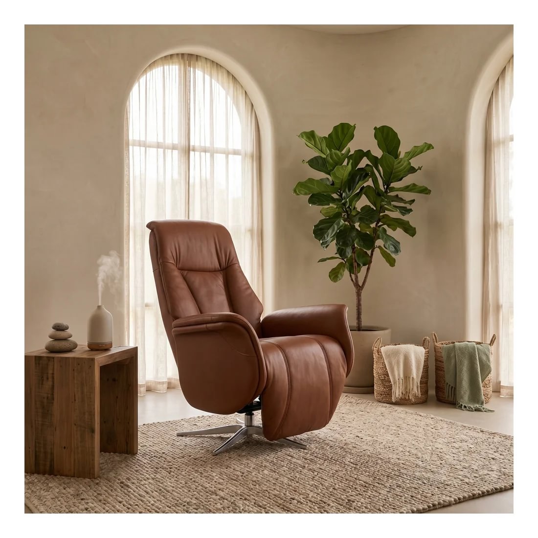 Stóllinn er klæddur slitsterku PVC-leðri sem er bæði auðvelt í viðhaldi og fallegt í útliti. Avignon fæst í nokkrum tímalausum litum – saddle, beige, dökkbrúnum, svörtum og gráum. Myndin sýnir stólinn í saddle lit. Hann er auðveldur í samræmingu við ólíkar innréttingar og hentar vel í stofuna, sjónvarpshornið eða lestrarhornið.